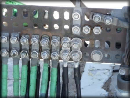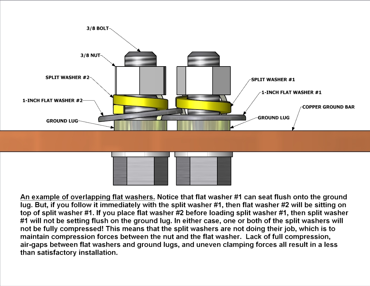 If you are using large flat washers, you may be grinding flats on the sides in order to fit two lugs side-by-side on the bar. After all, you want to use every set of holes on that expensive bar. Well, that grinding wheel you used was used previously to grind some copper, steel, iron, and/or aluminum. The particles of material from those earlier grindings now have been embedded into the sides of your flat washers to form contaminating particles, degrading your carefully-installed bond installation. Or, you may be using the large washers without grinding flats. This means you are either stacking washers on adjacent lugs, or you are wasting ground bar space by skipping holes.