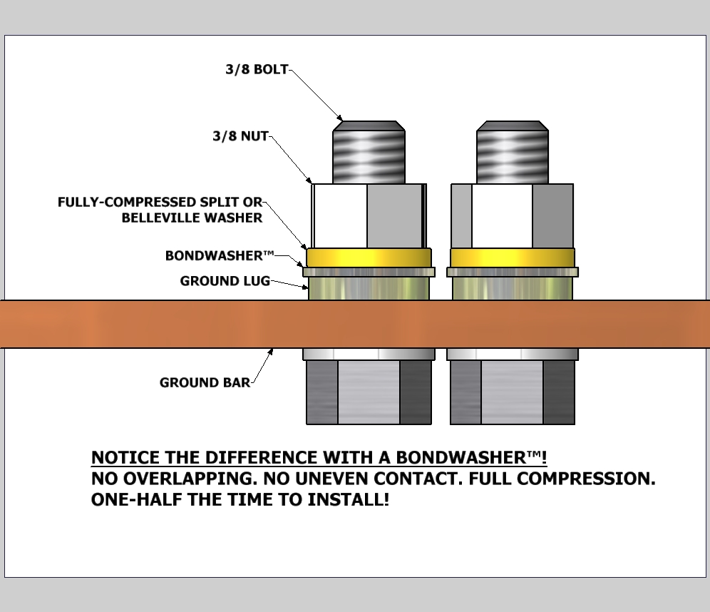 Our Bondwasher® is one continuous piece, not two separate washers with gaps between them. Using a stainless 3/8-16 bolt and nut, the correct amount of torque you should apply to the nut is about 22 foot-pounds. This results in about 3,600 pounds of clamping force under each nut, or 7,200 pounds of force between ground lug and ground bar! This clamping force is spread evenly by the Bondwasher® to the ground lug, resulting in a uniform gas-tight seal between the lug and bar. This uniform clamping force promotes an intimate electrical connection, resulting in the lowest possible resistance.This clamping force also helps reduce the chances of passive intermodulation (PIM) at the lug and bar interface. In the grounding world, low resistance and a gas-tight seal are the conditions you need to prevent corrosion between lug and bar, resulting in the best electrical connection! Bondwasher® in your electrical bonding installations results in a gas-tight seal between lug and bar.